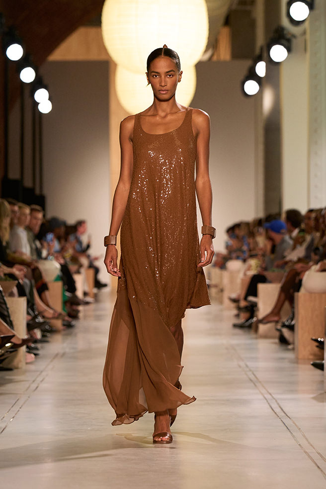 A cartela de cores reforçou essa simplicidade elegante, alternando tons pastel com neutros clássicos. Mas foram os detalhes que deram o charme final com destaque para as camisas e blazers acompanhadas com maxicolares e os cintos usados em dupla que estruturavam a cintura de maneira criativa. Para a noite, os mesmos shapes apareceram, só que dessa vez em versões cobertas de paetês e brilhos metalizados, provando que a silhueta se mantém versátil em diferentes ocasiões.